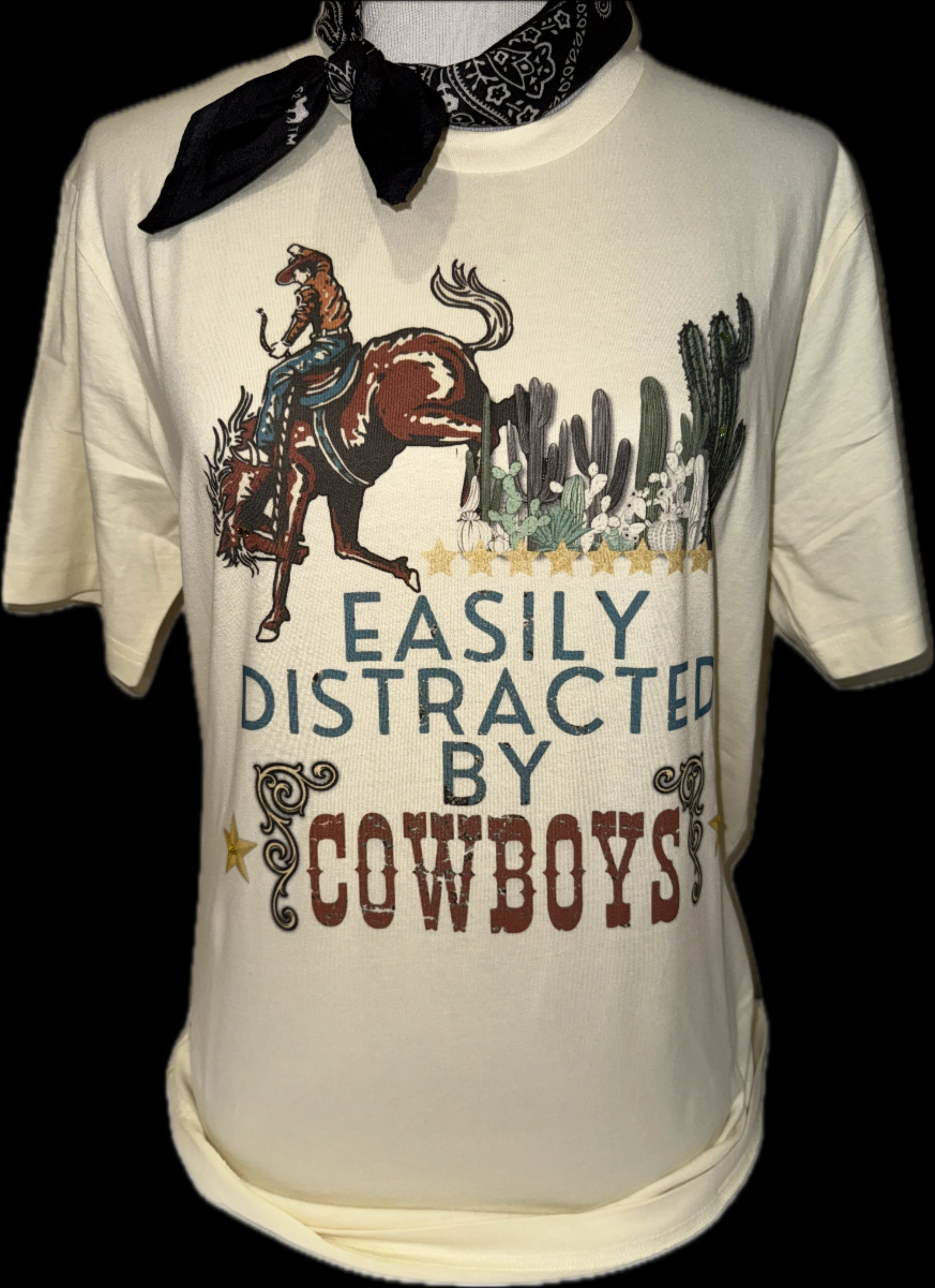 Stay cute and cowboy-crazy in the “Easily Distracted by Cowboys Crew” — the ultimate cozy tee for the gal who can’t resist a good hat, a slow drawl, and a little rodeo romance!