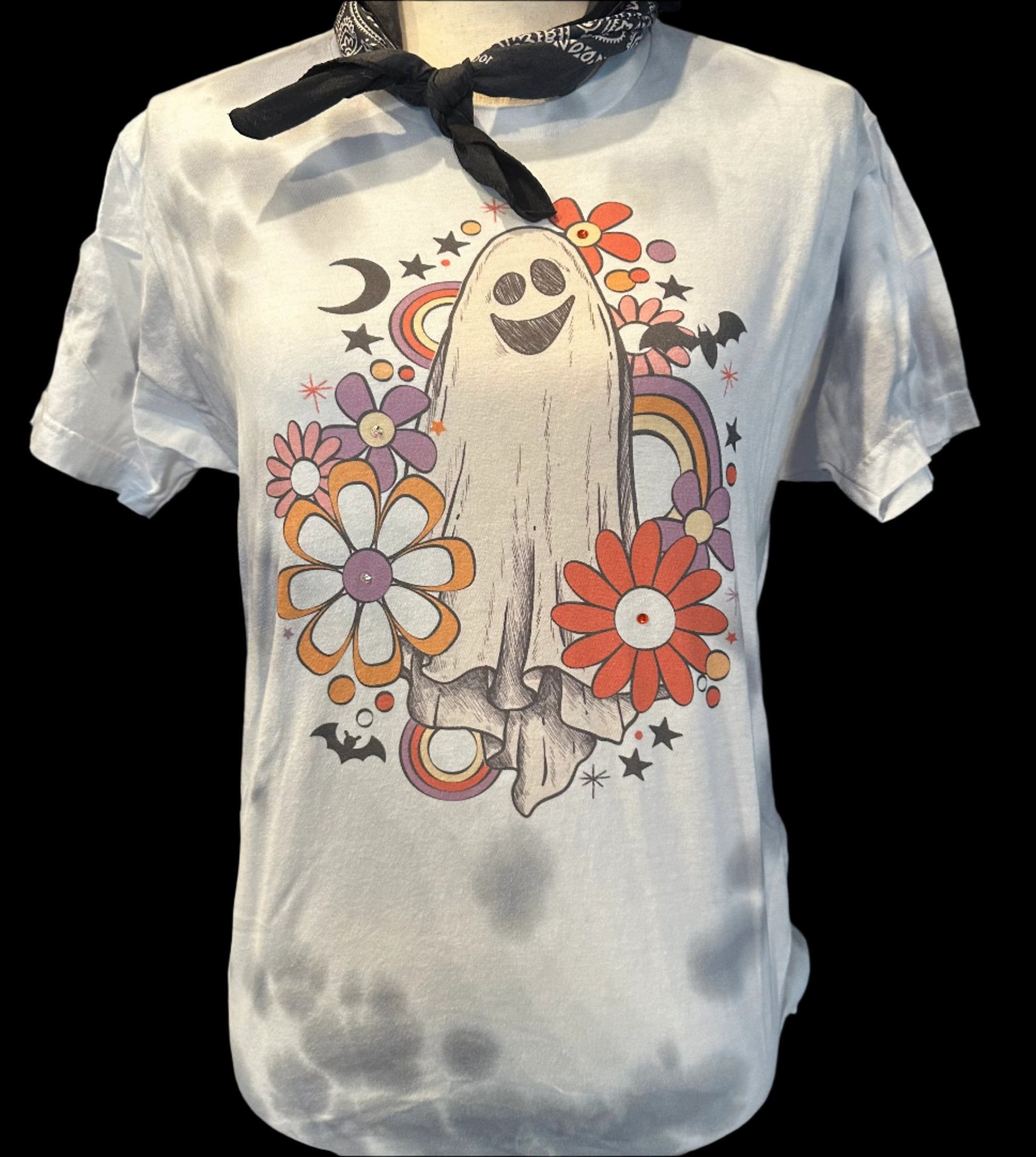Groovy Flower Ghost on Tie-dyed White/Grey Crew