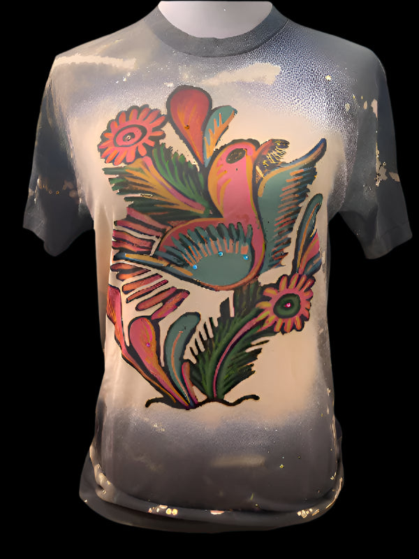 This design features a colorful Mexican bird perched amidst vibrant florals, capturing the lively spirit of Mexican culture. With its bold colors and intricate details, it brings a festive, artistic touch to any casual look.