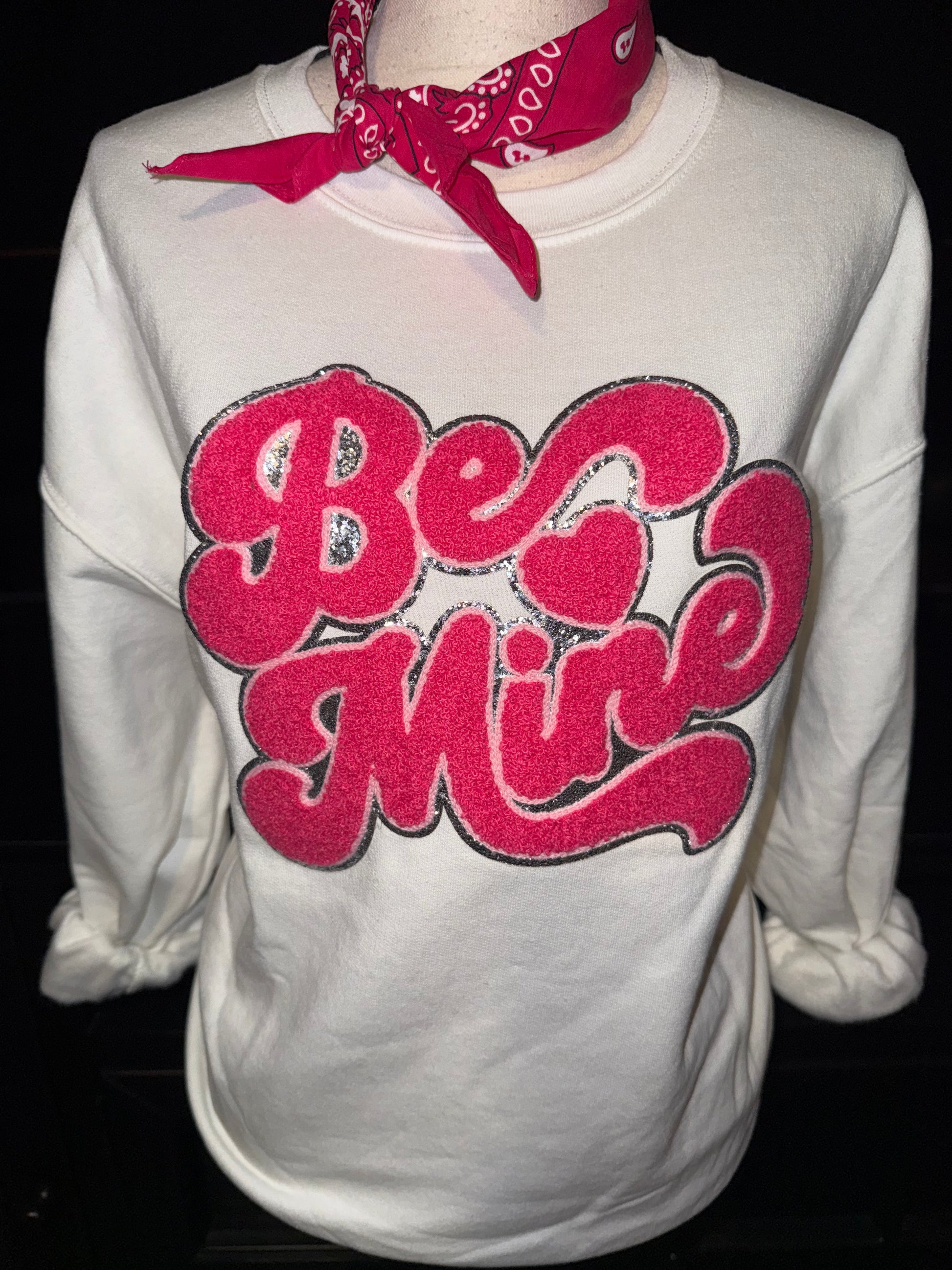 Pink Chenille Be Mine Patch on White Sweatshirt