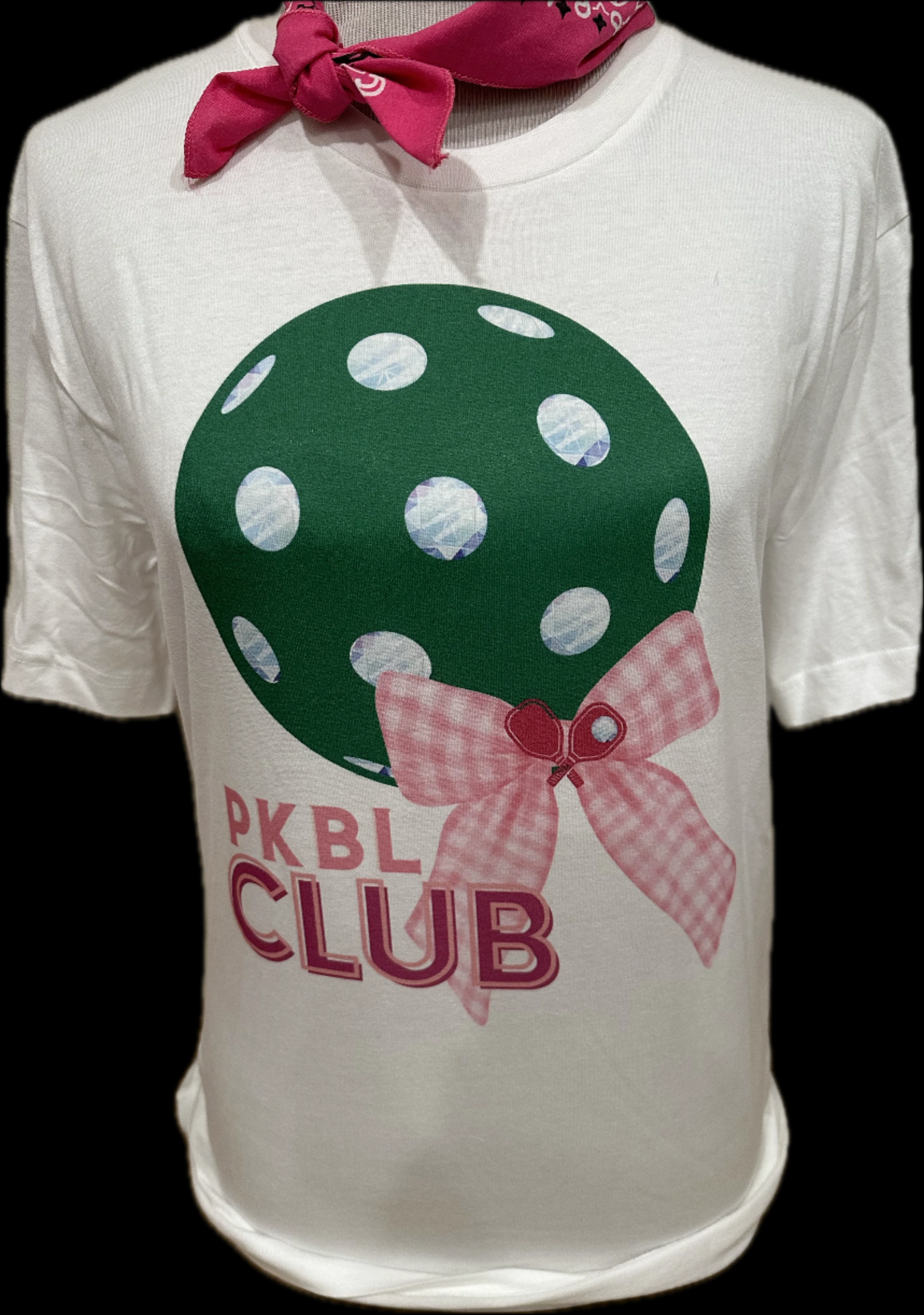 Smashing it at the Pickleball Club, ball in hand, with a cute pink bow for extra flair!