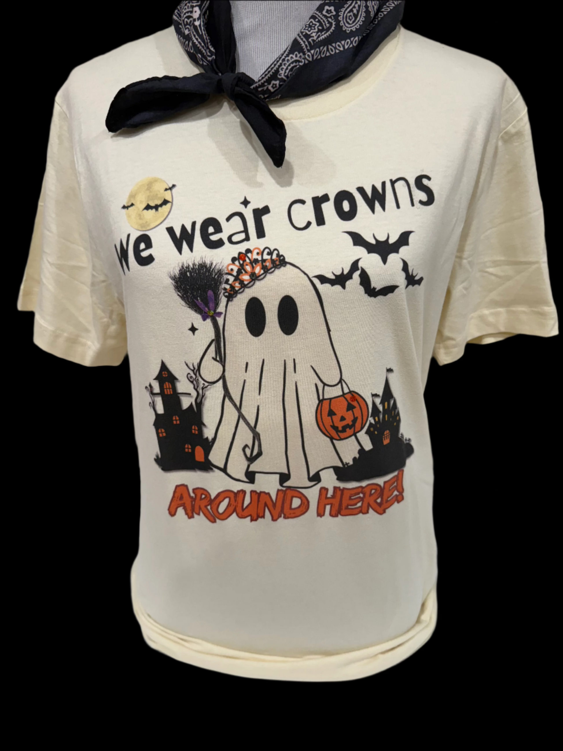 Get ready to haunt in style with the We Wear Crowns (Ghost) Around Here crew — a spook-tacular mix of royalty and Halloween spirit. Whether you're trick-or-treating or sipping pumpkin spice, this tee lets everyone know you're the ghostly queen of the season!